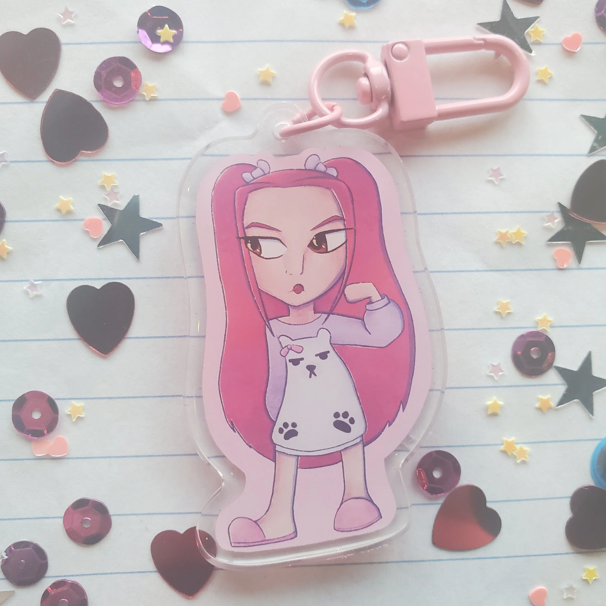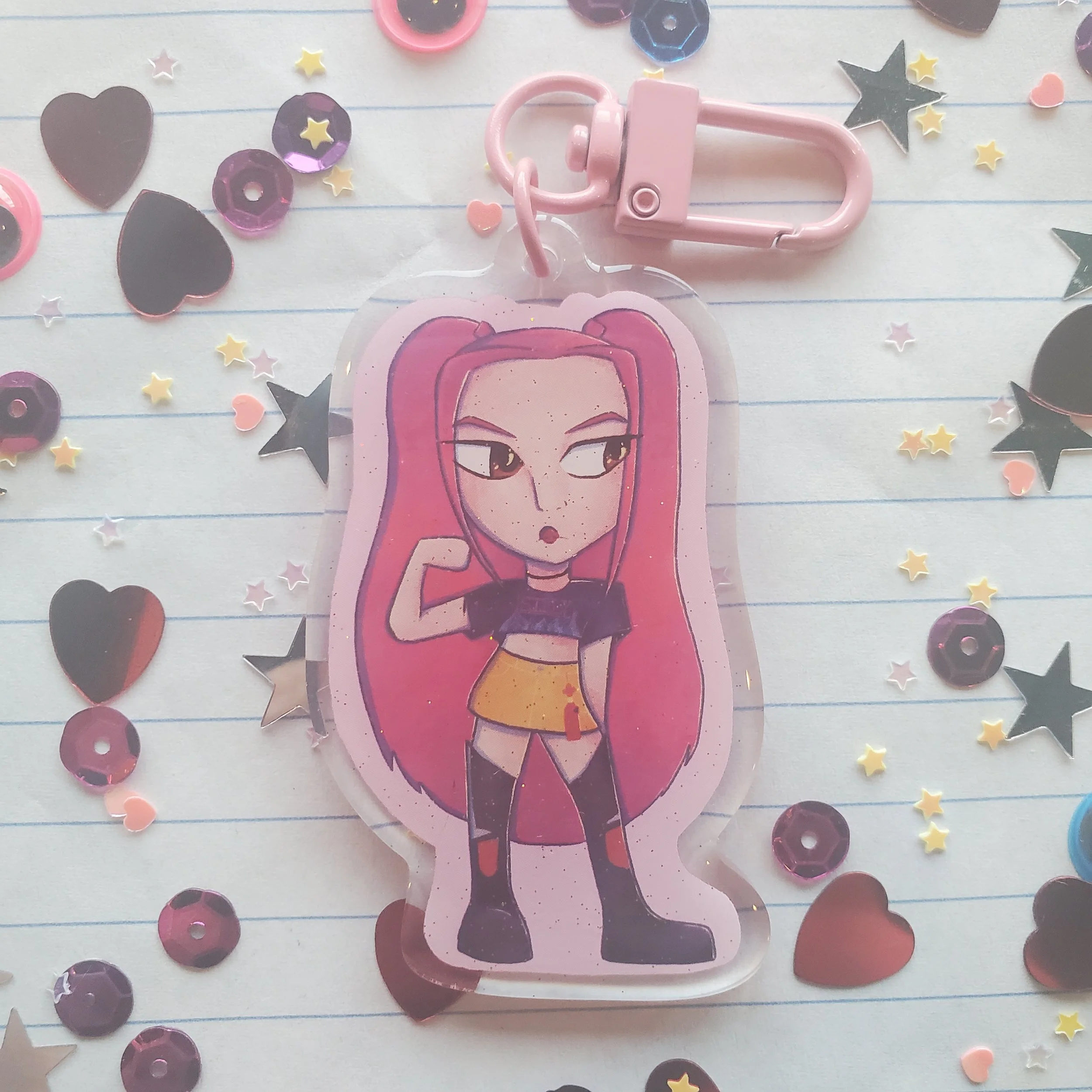 Image 1 of 2 Image 2 of 2 Mira - keychain $10.00 2.5” double sided keychain with a glitter epoxy coating and a pink clasp Quantity: Add To Cart Added! 2.5” double sided keychain with a glitter epoxy coating and a pink clasp